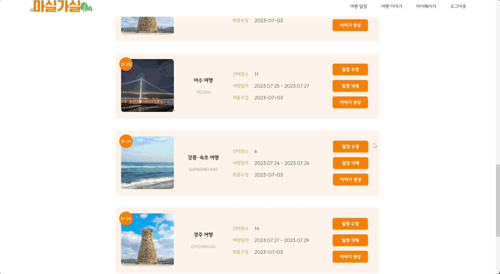 사용자 마이페이지에서 등록한 여행일정을 확인할 수 있으며, 등록했던 여행일정을 다시 편집하여 저장할 수 있습니다.