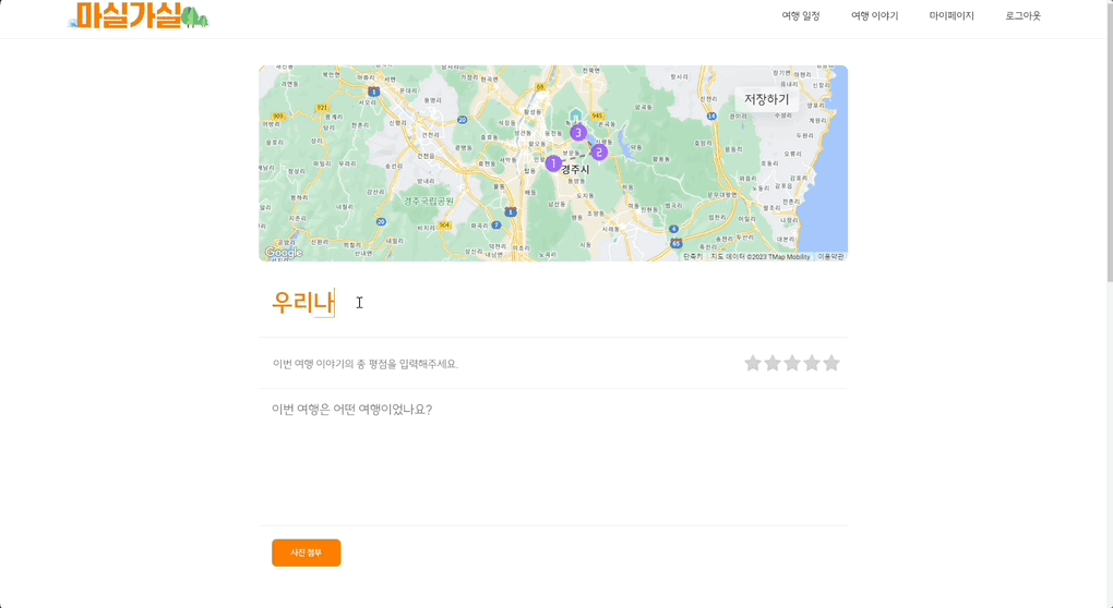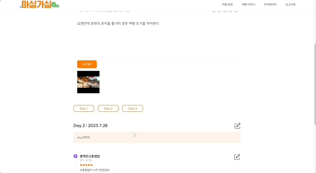 등록했던 여행일정에 대해서 여행 이야기를 생성하여 들렀던 장소에 대한 평점 및 별점을 남길 수 있습니다.