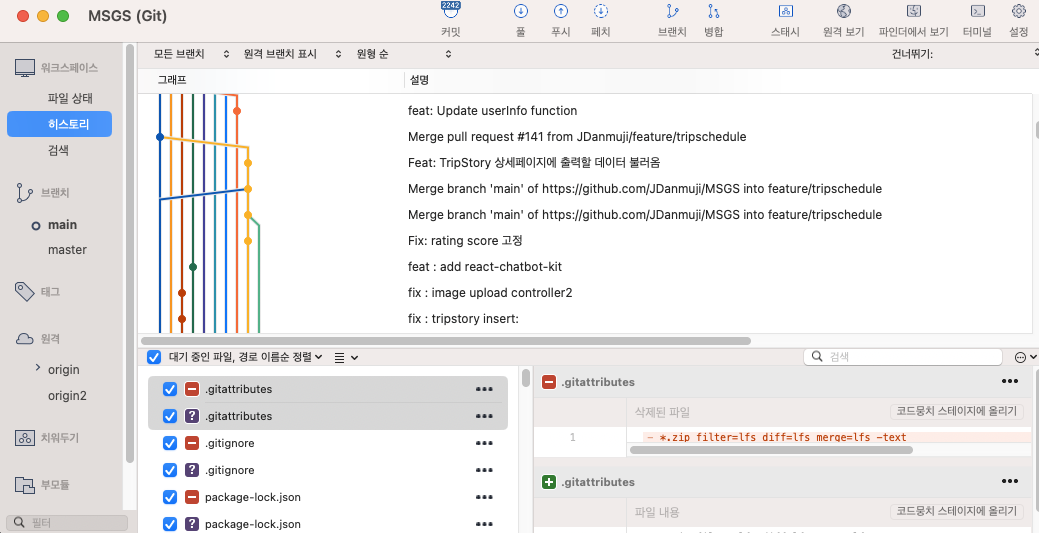 Source tree를 이용하여 브랜치 경로와 메인 버전 관리를 진행했습니다.