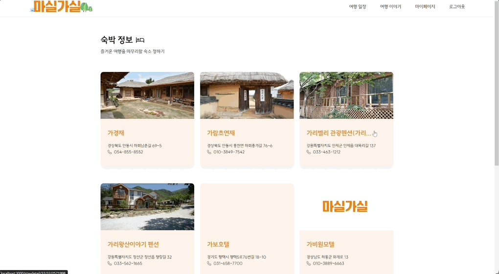 마실가실의 주요 기능인 여행일정, 여행이야기 기능을 이용할 수 있으며 사용자들이 등록한 여행이야기 리스트를 확인할 수 있습니다.