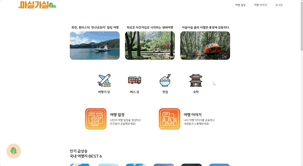 메인 페이지에서는 국내 여행 코스 api 를 사용한 배너들을 확인할 수 있으며,