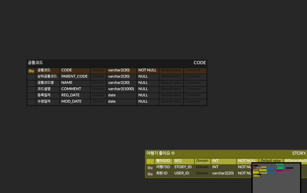 데이터의 동일성과 유동성을 고려하여 공통코드 테이블을 분리하여 전체적인 데이터들의 의미있는 코드화를 진행했습니다.