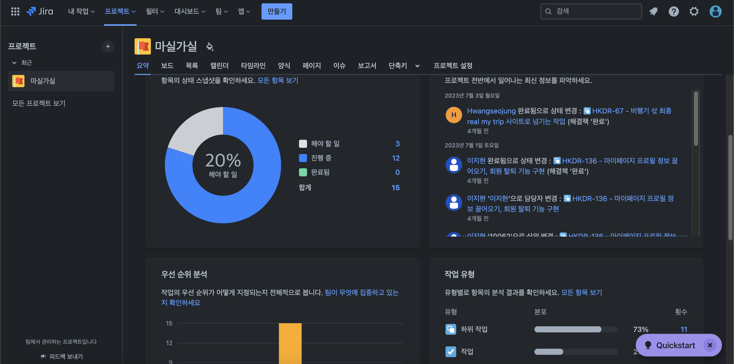 jira를 이용하여 프로젝트 업무 할당 및 진행 현황을 파악했으며 프로젝트의 필요 정보들을 우측에 정리했습니다.