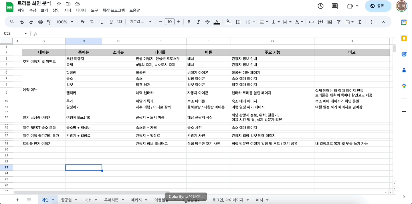 팀원들마다 각자 기능들을 담당하여 트리플과 마이로 사이트를 분석하여 해당 내용을 excel 에 정리하고,